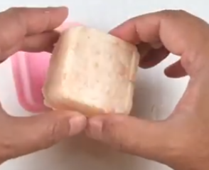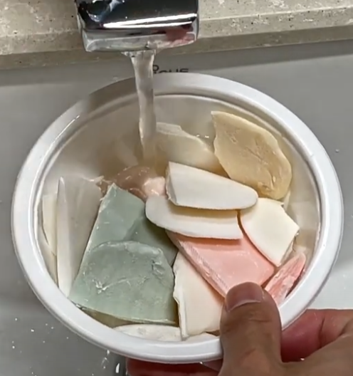 만들 형태의 용기에 조금씩 넣고 눌러서 통비누를 만든다.
